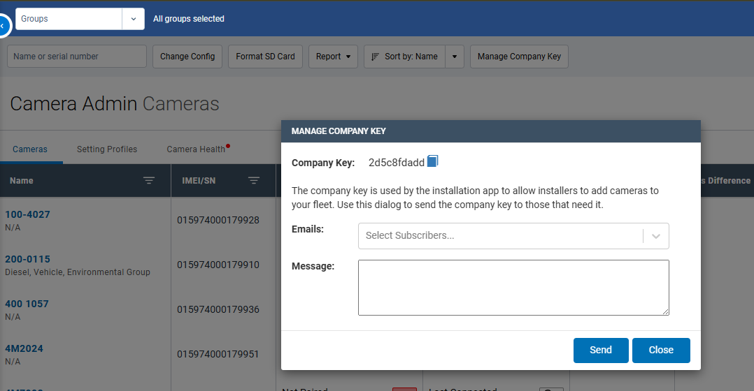 A company key is a unique alpha-numeric code that is distributed to installers using the Rosco Installer app to install cameras into your fleet. The installers must have this key before they can do any installations.