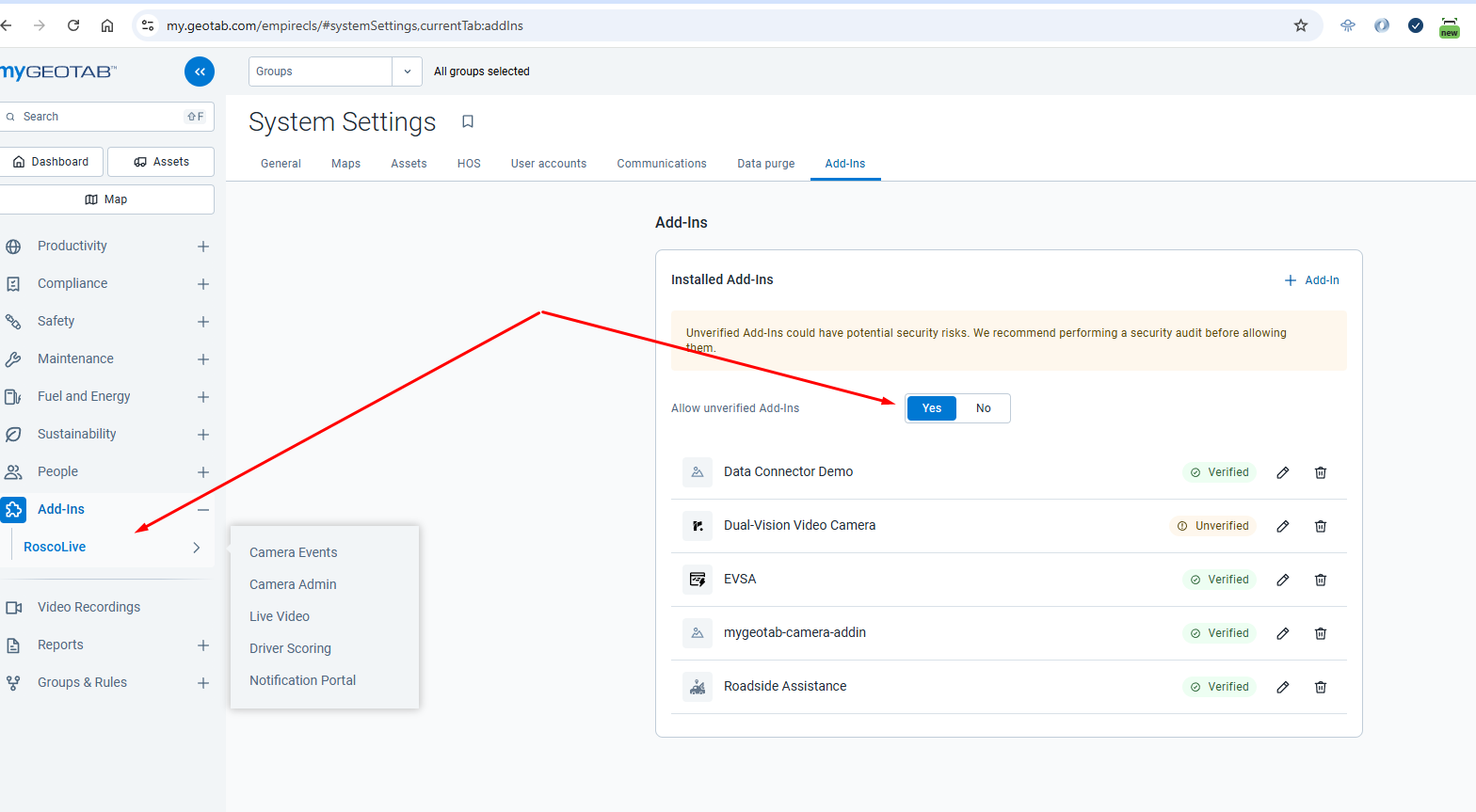 Unlike most add-ins for Geotab, the RoscoLive add-in is a simple and seamless process that doesn't require you to copy/paste any configuration files or worry about setting up notification webhooks to get things running, we do all of that for you! Follow these few easy steps to get your integration up and running.