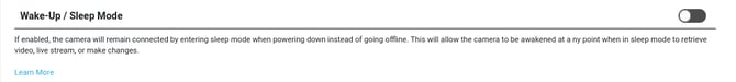 Wake-up / Sleep mode is by default disabled for all cameras upon installation and for all settings profiles. If you do not wish to have this feature enabled for any or all of your cameras in your fleet, then no actions are required and your cameras will still continue to operate normally and fully powering off without the ability to be awakened.