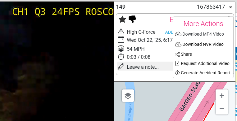 For any event video, open the More Actions button by clicking the 3-dot menu button in Event Info box. An option to Request Additional Video will be available for you to click which will open the Event Context Video request menu where you can select a length of video you wish to get and optionally a note that will be stored with the event for later reference.